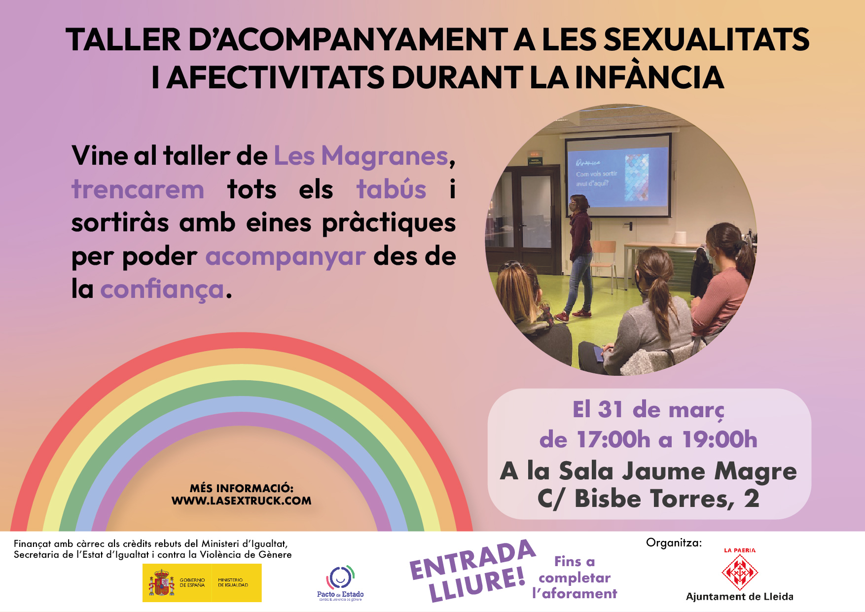 Taller impartit per Les Magranes on es tractarà el tabú que amb infants no es pot parlar de sexualitats i s'aprofundirà en consells i eines pràctiques per poder acompanyar amb confiança aquest àmbit de la seva vida.