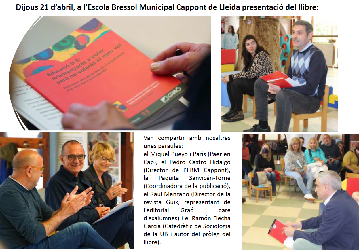 El passat dijous 21 d’abril, l’Escola Bressol Municipal Cappont va celebrar la presentació del llibre de l’editorial Graó “Educació 0-3: m’ensenyaràs a volar però no volaràs el meu vol” que l’Equip Docent del centre ha escrit conjuntament amb la Paquita Sanvicén-Torné (professora de Sociologia de la UdL).