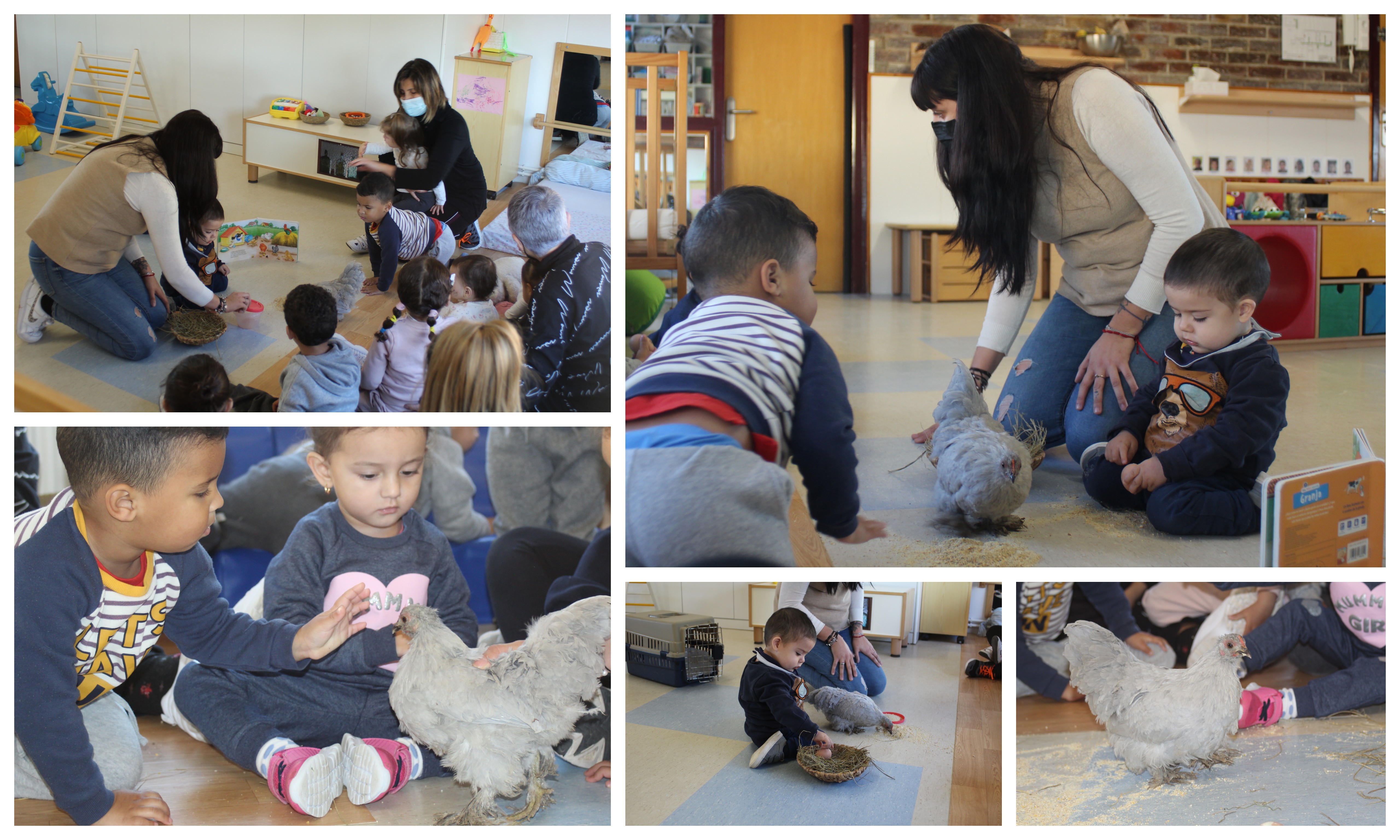 En la primera sessió, l’Àurea acompanyada del seu fill, ha decidit mostrar una de les seves gallines, alguns ous i un llibre amb imatges i sons d’animals de granja als infants.