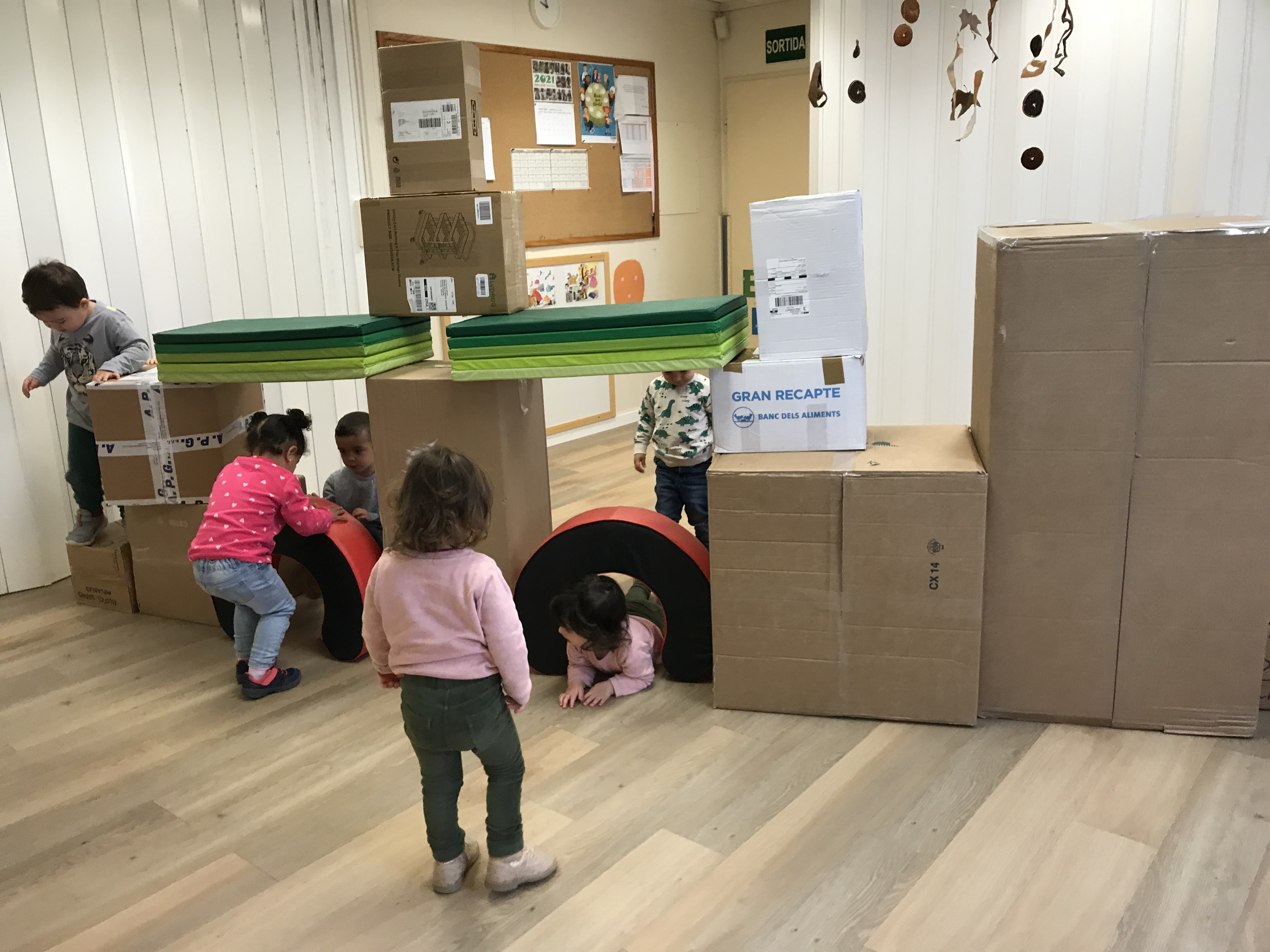 El joc amb capses és una sessió multisensorial que acostumem a realitzar a l'escola. Cada curs plantegem l'activitat de forma diferent, enguany hem presentat les capses de diferents mides totes tancades i en forma de mur per a propiciar la construcció. Alguns infants primer han passat per sota dels arcs i d'altres de seguida han tombat el mur i han començat a apilar, arrossegar, carregar... Han obert algunes capses i les possibilitats de joc s'han multiplicat, entrant i sortint, amagant-se, descobrint-se...