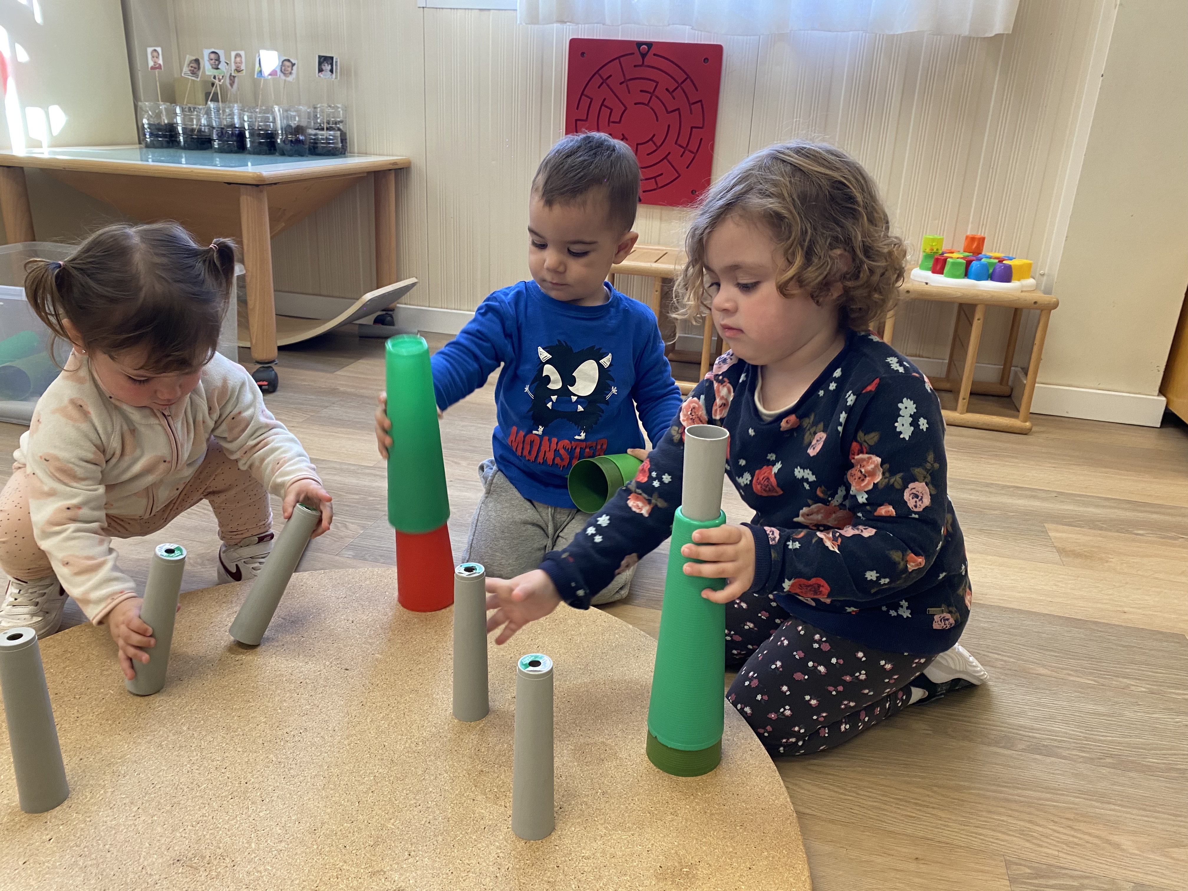 A l'escola oferim diversos materials als infants amb els quals poden jugar a construir. Aquests tubs, més amples d'un costat que de l'altre, els permet arribar a fer construccions molt altes i també haver de buscar solucions quan no hi arriben.