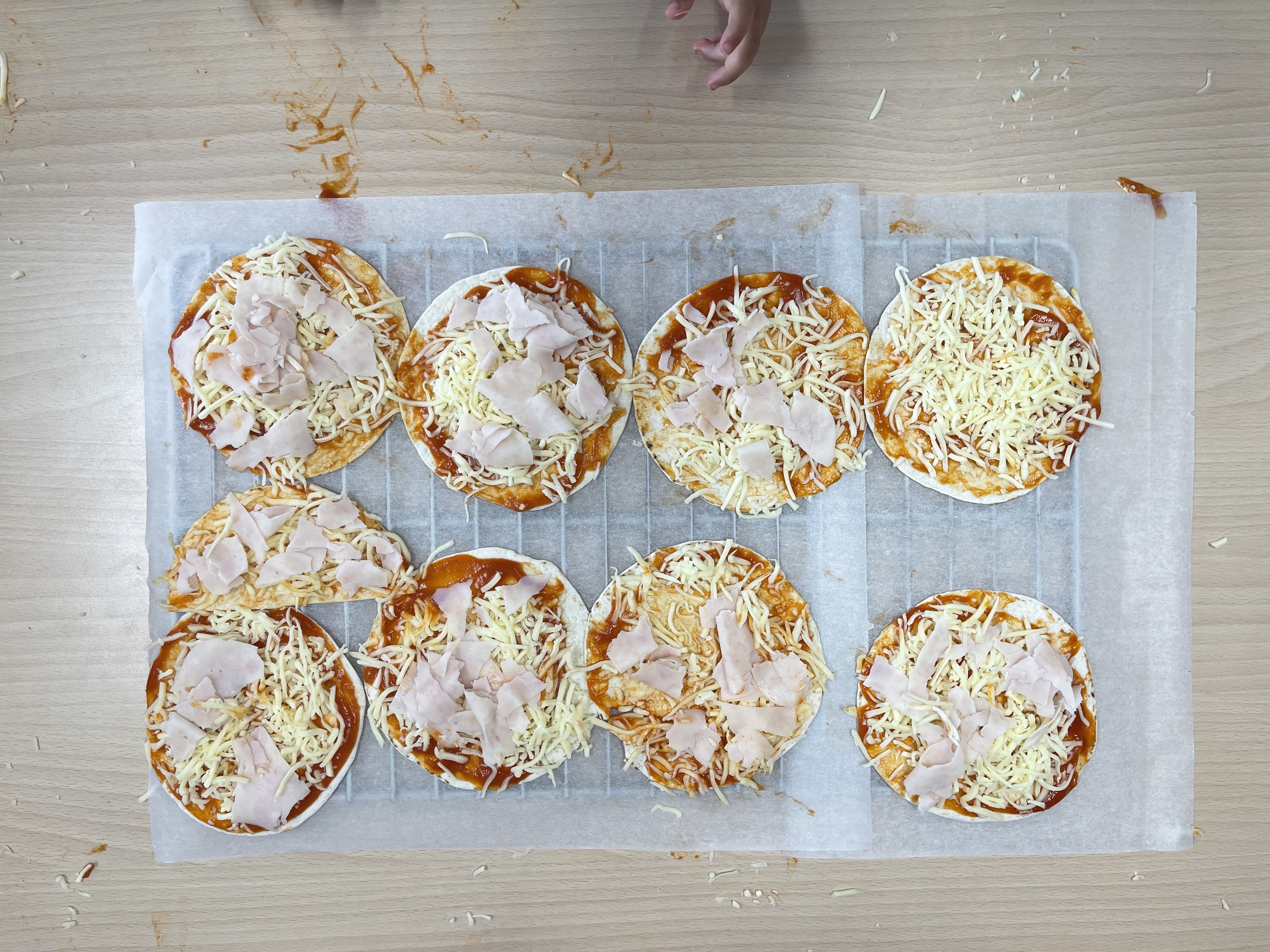 Avui cada infant ha elaborat una pizza amb una base de "tortilles de blat", tomata, formatge ratllat i gall d'indi. Les hem posat al forn i després ens les hem menjat. Quin esmorzar més bo!!!