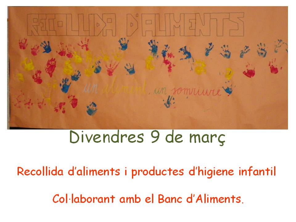 Com cada any, la nostra escola col·laborant amb el Banc d'Aliments, duu a terme una serie d'activitats amb els infants i es demana a les famílies que facin una petita aportació d'aquest productes per ajudar a famílies més desfavorides.