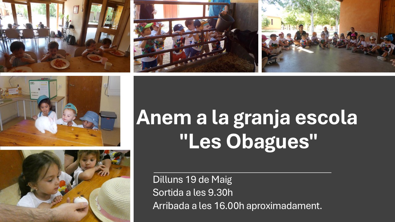 El proper dilluns 19, anirem a passar el dia a la granja escola "Les Obagues". Veurem els animals que allí hi ha, ens quedarem a dinar i a dormir i cap a les 16:00h tornem.