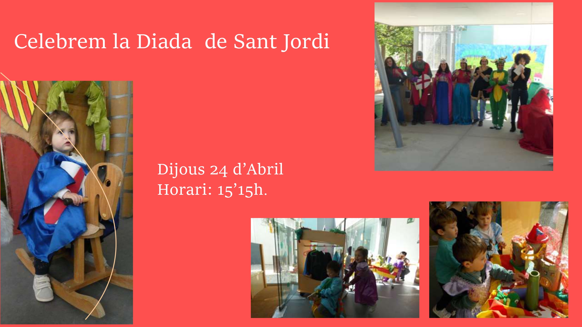 El dia 24 d'Abril celebrarem la festa de Sant Jordi a l'escola. Farem la representació de la Llegenda amb la col.laboració dels pares.